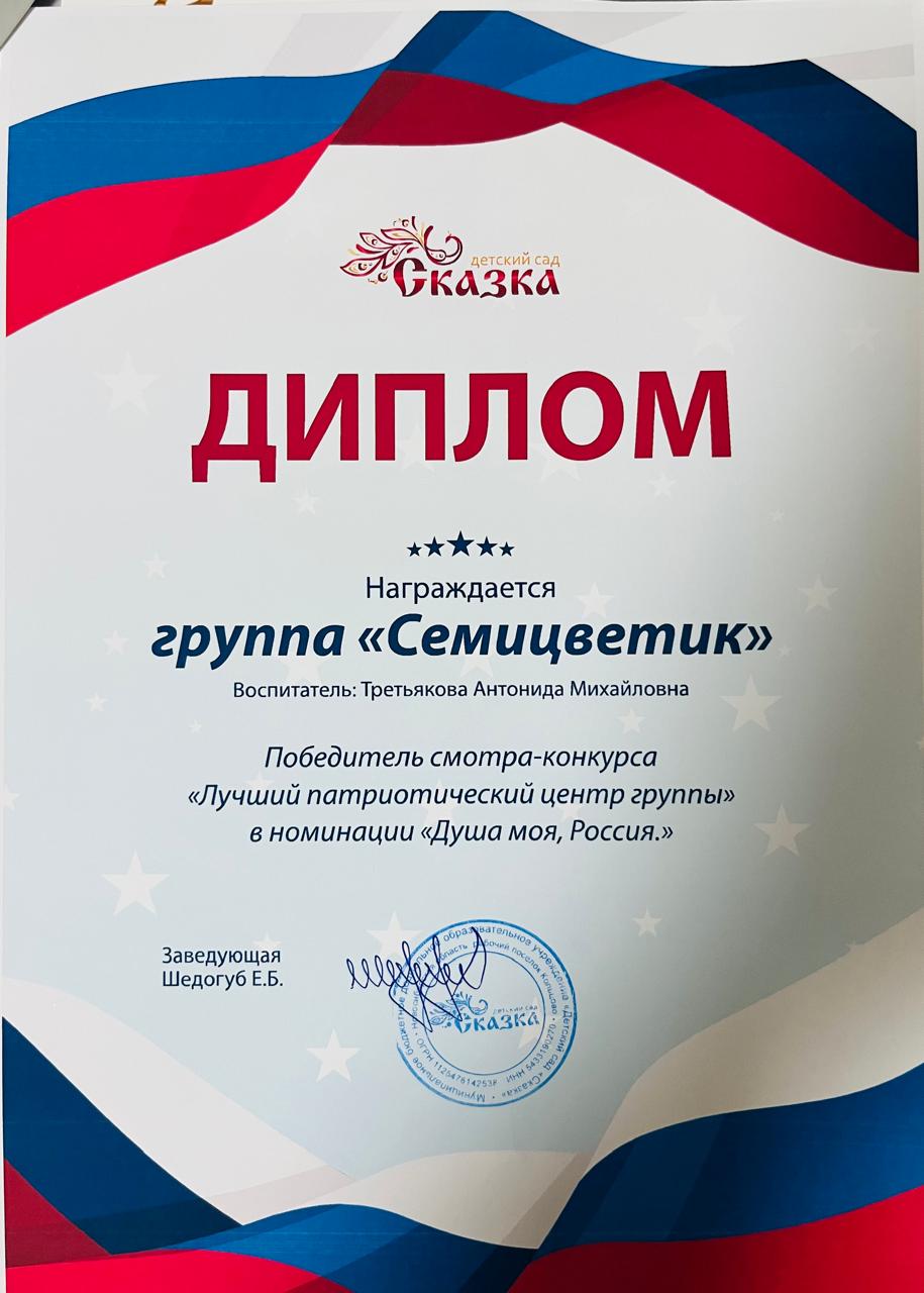 диплом победителя смотра конкурса ""Лучший патриотический центр группы"