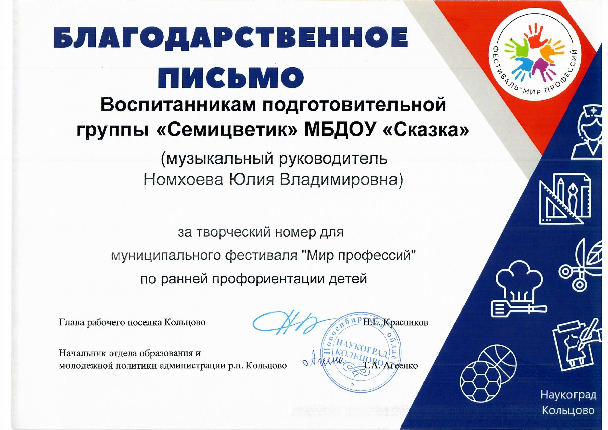 Благодарность заведующего МБДОУ "Сказка" за участие в смотре-конкурсе театральных уголков